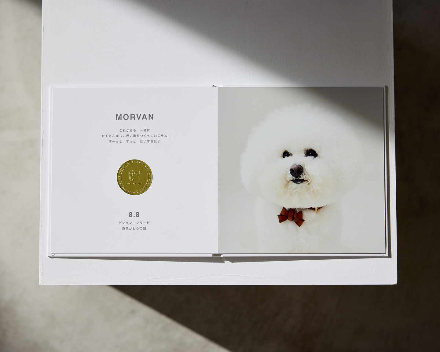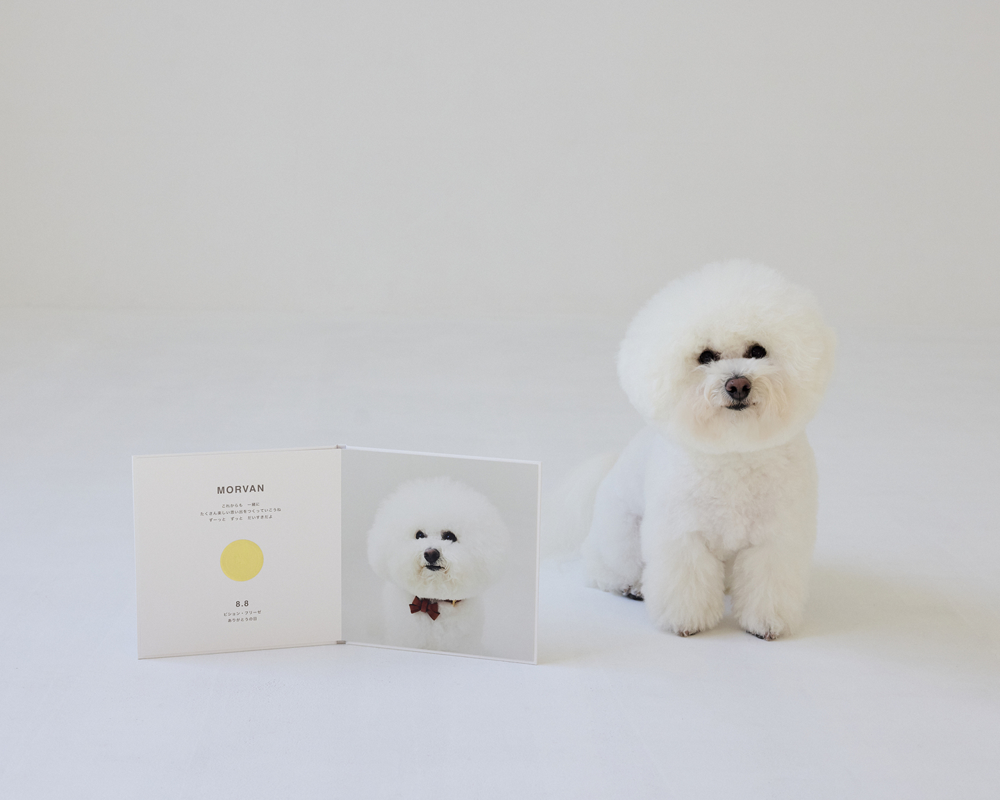 本文 左ページ:わんちゃんのお名前とメッセージ 右ページ:お写真をドーンと1枚