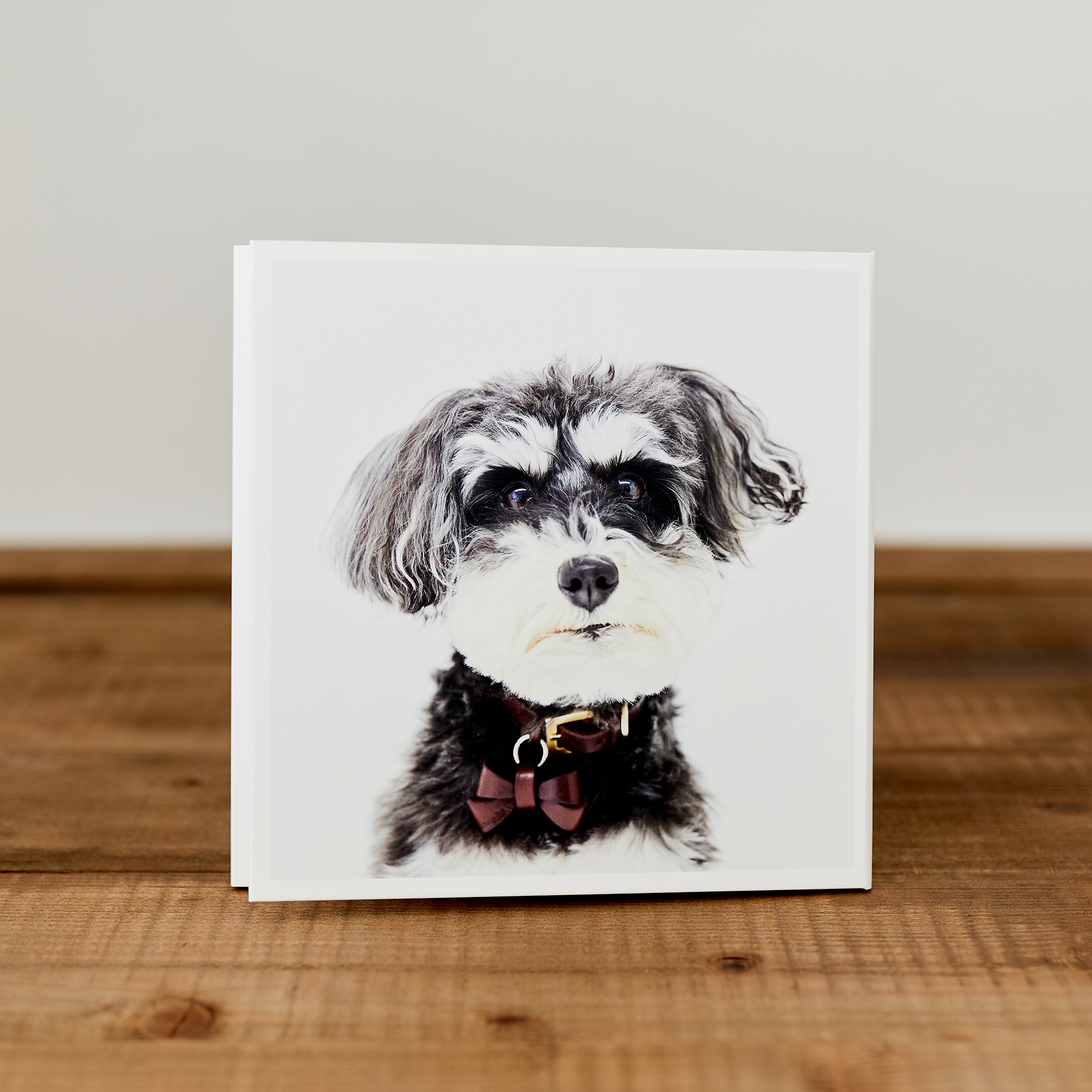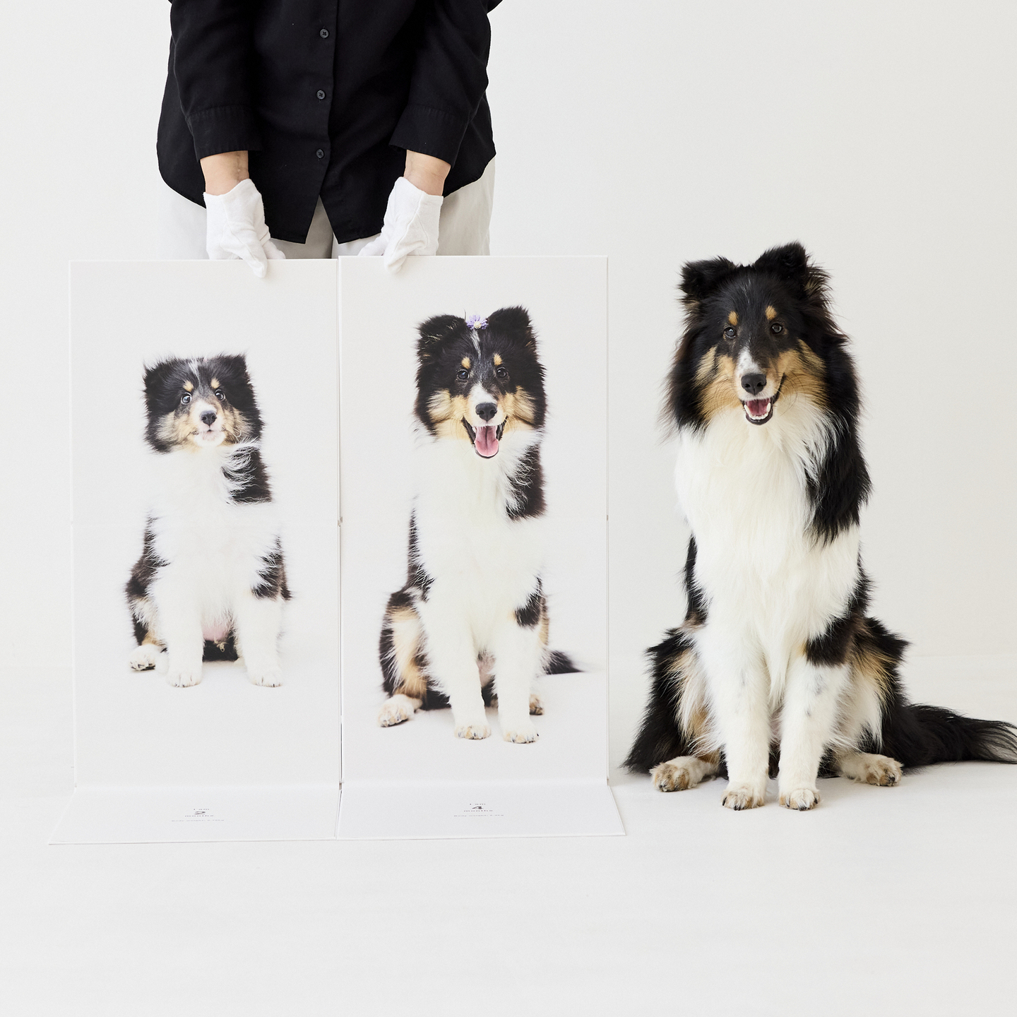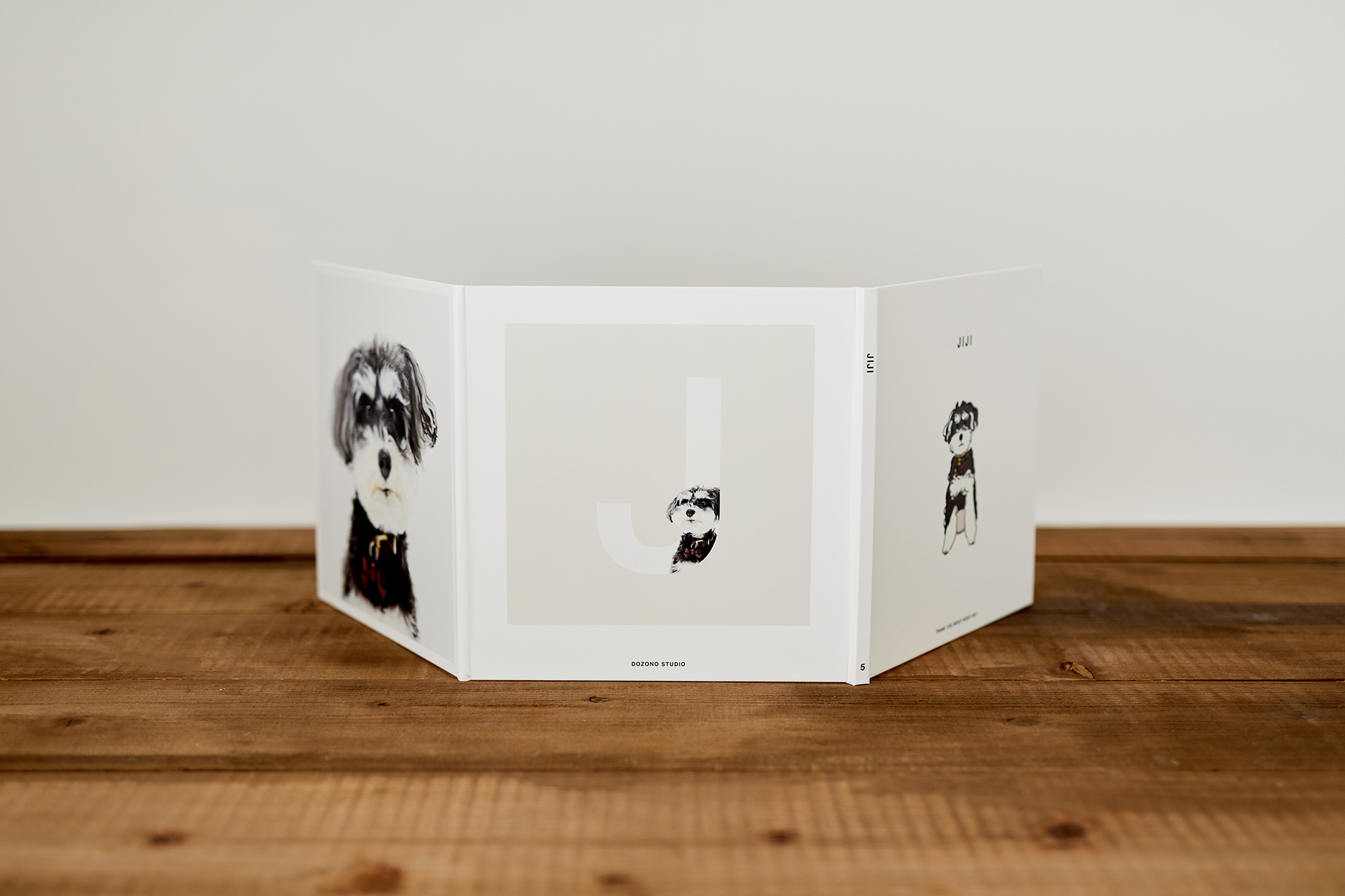 初めて家族になった犬が老犬になり、綺麗に撮れているパピーだった頃の写真が少ないことに気づきました。後で成長を振り返ることができるよう、2頭目に迎えた子の記録は、しっかり残してあげたいなと思い、今回撮影に参加しました。お店で見本は見せて頂いていましたが、実際に我が子の「ONE BOOK」を手にすると、今にも本から飛び出してきそうで、すごい迫力でした。瞳や毛の質感など、リアルに表現されていて、でも自然で、デザインもとても素敵でインテリアの一部として、いつまでも飾って置けそうです。ありがとうございました。