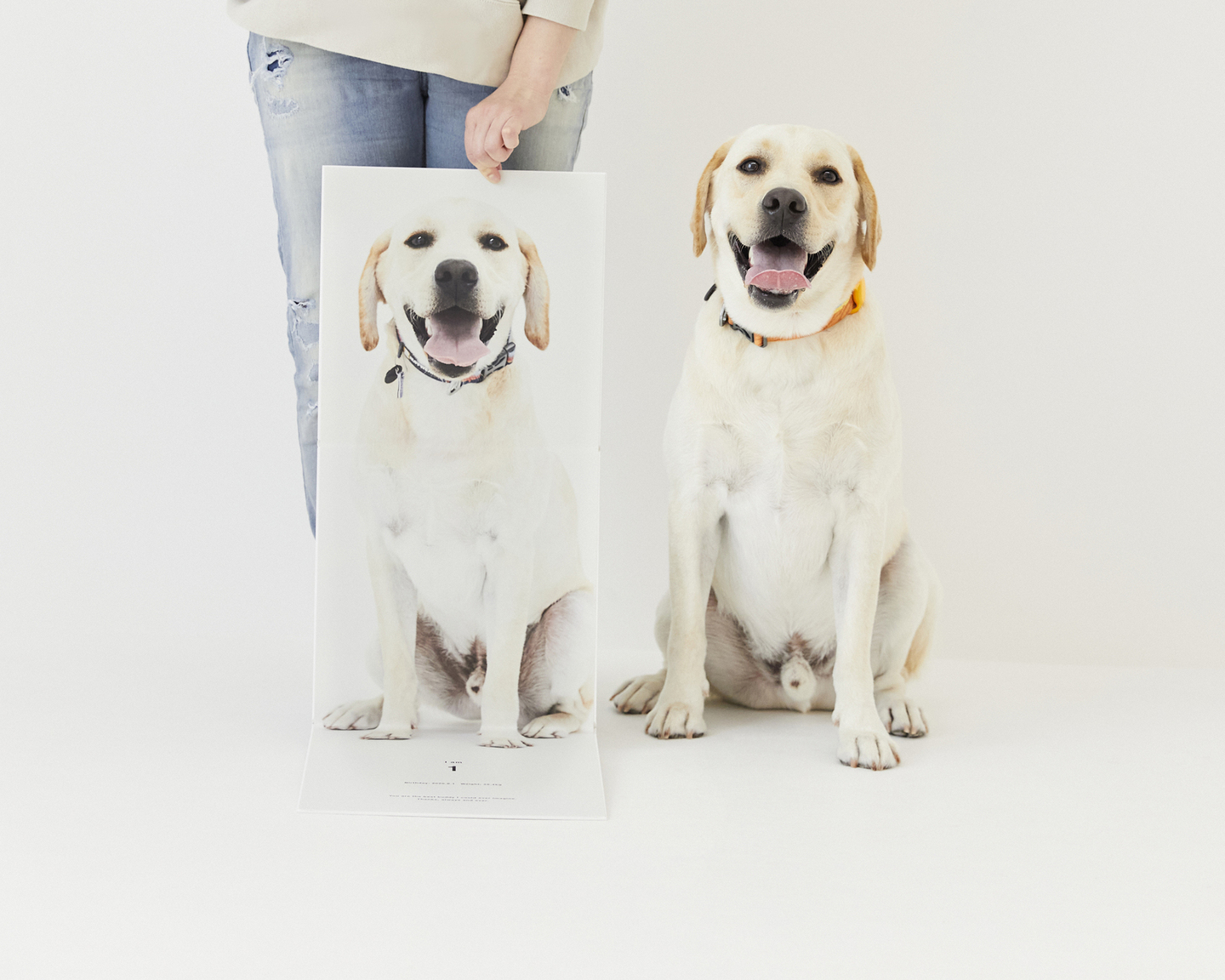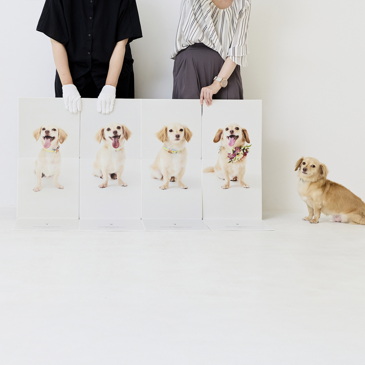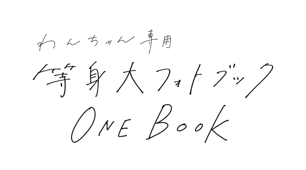 大型犬のわんちゃんが、ONE BOOKをつくったイメージです。本をひらいた時に、うちの子の愛嬌のある写真が、実寸大でこちらを見ていたら・・・