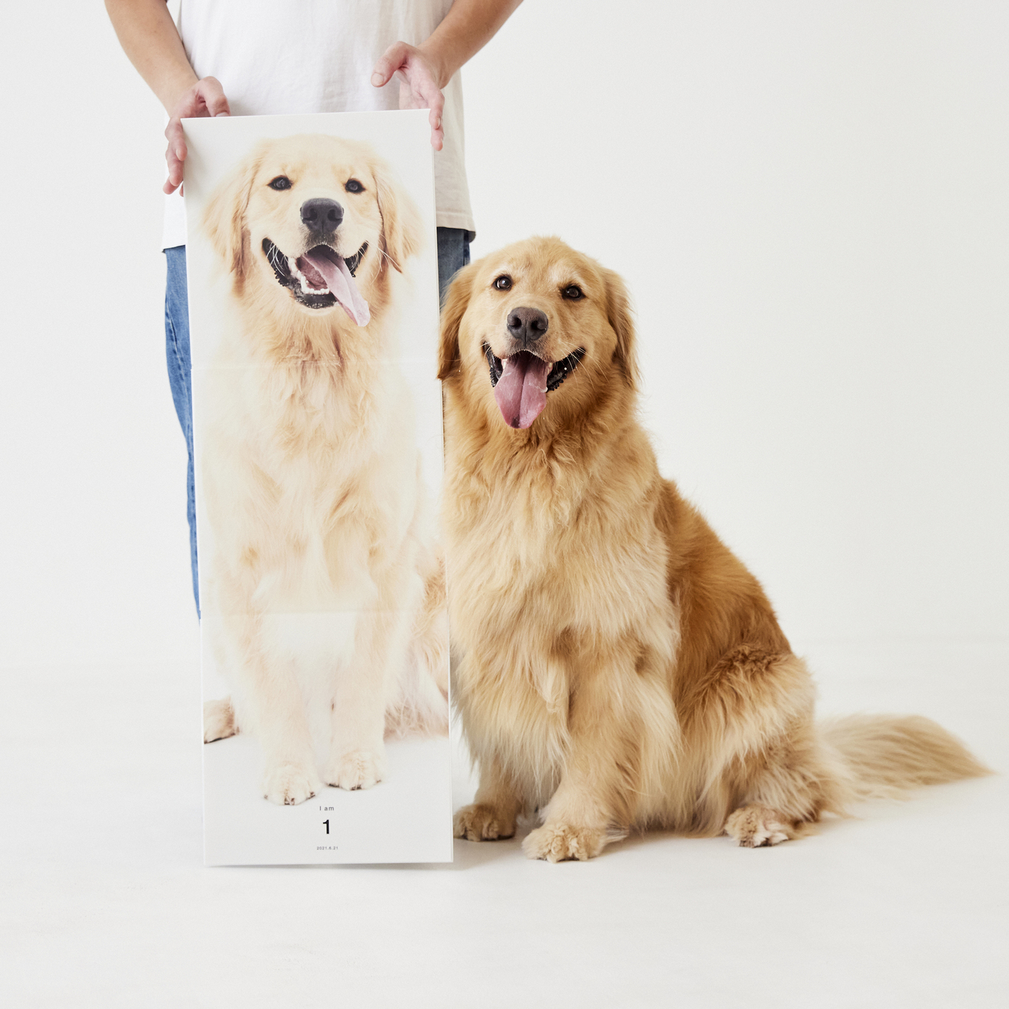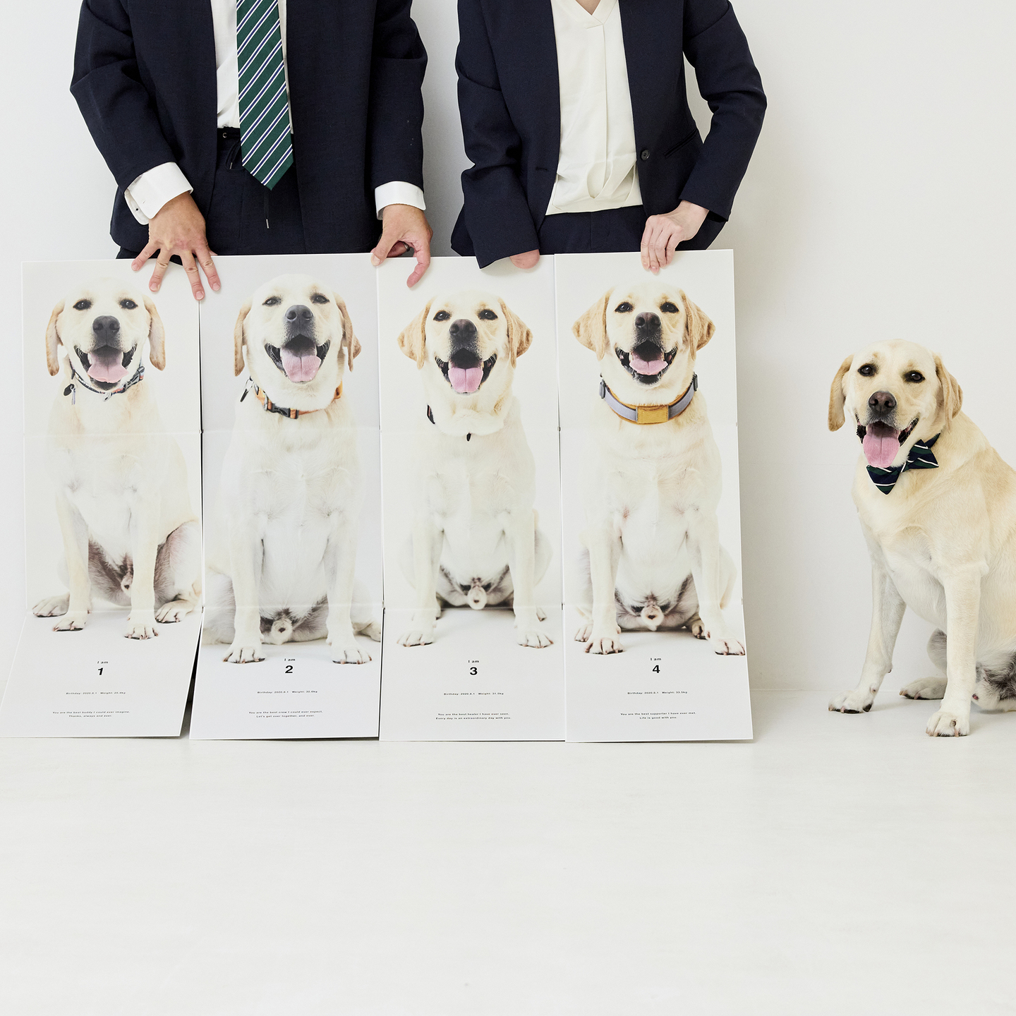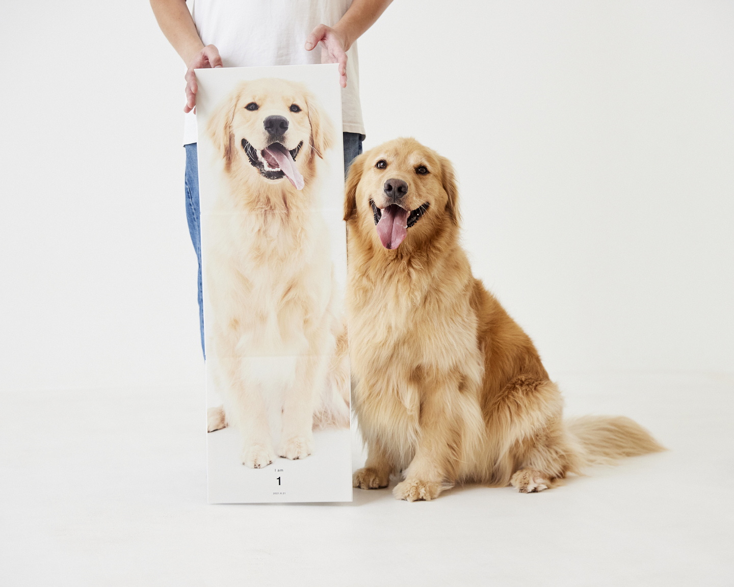 大型犬のわんちゃんが、ONE BOOKをつくったイメージです。本をひらいた時に、うちの子の愛嬌のある写真が、実寸大でこちらを見ていたら・・・
