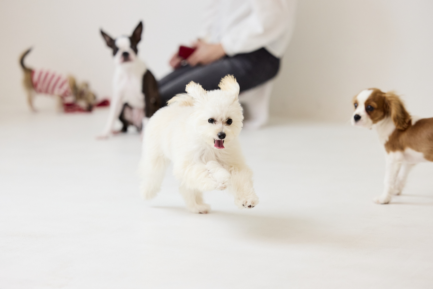 ドッグトレーナーの指導をしている出口先生が安全に見ている中で、わんちゃん同士の遊びを通じて子犬の「社会性」を身につけられる場所。